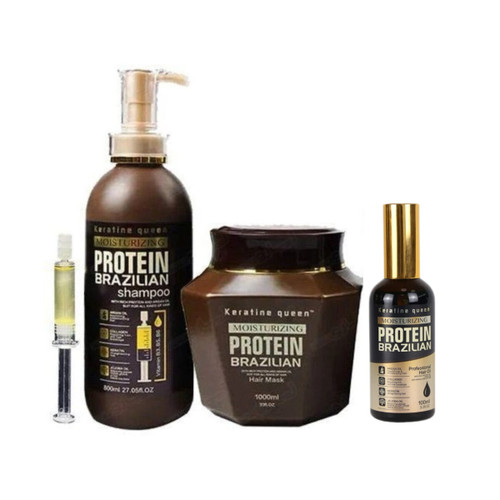 پک شامپو، ماسک و روغن مو بدون سولفات کراتین کویین برزیلی مدل پروتئین ( حجم 800 + 1000 + 100 میل) (واردات قانونی ارسال از منطقه آزاد ارس)